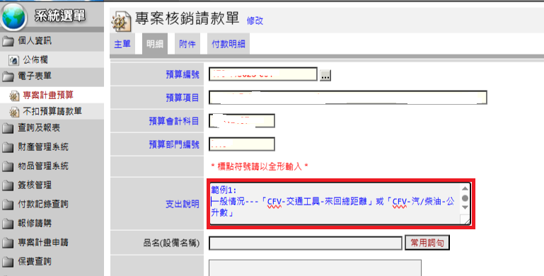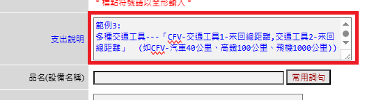 二、人會總系統填寫CFV:在人會總系統填寫交通費核銷單據(如公差旅費表、支出黏貼憑證)時,請於明細中的「用途說明」或「支付說明」欄位填上「CFV-交通工具-來回總距離」或「CFV-汽/柴油-公升數」。具體情況不同範例如下:
