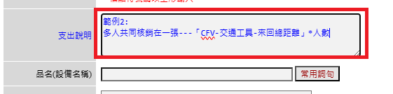 2.範例二:多人共同核銷於一張──「CFV-交通工具-來回總距離」*人數 (如:CFV-機車20公里*3人)